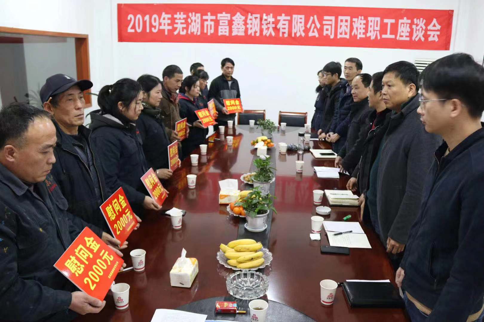 2020年春節(jié)將至,為讓困難職工度過一個溫暖祥和的春節(jié),1月7日上午,公司工會組織召開2019年度蕪湖市富鑫鋼鐵有限公司慰問困難職工座談會??h總工會黨組成員/副主席阮熙明、縣經(jīng)信局黨委委員/副局長戴元根、縣經(jīng)信局黨委委員/系統(tǒng)工會主席郝建 、縣總工會法工部副部長張陽、新港鎮(zhèn)總工會主席湯向東應(yīng)邀出席會議,公司10名困難職工代表參加會議。